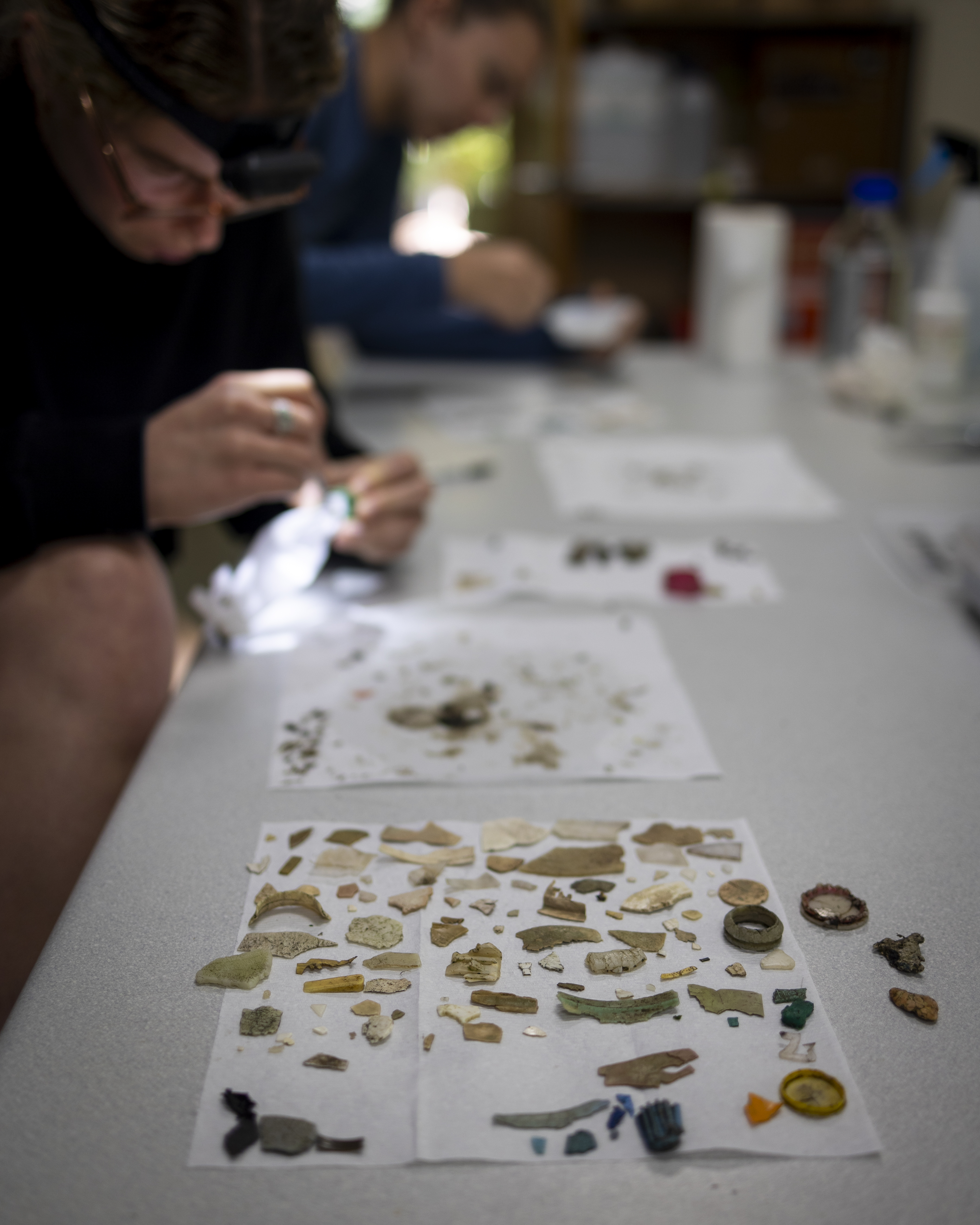 We pause, both on our knees, scanning the thin line of pale coral fragments, sponge and twigs. I spot one - a flat, turquoise rectangle five millimetres across. I reach to pass it to Michelle, a paper cup in her hand used to hold the half dozen pieces she has already found.